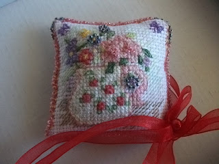 Cross Stitcherin ilmaiskitistä tuunattu kukka-kannu sai helmillä viimeistellyn reunan,kokeilin tekniikkaa ensimmäisen kerran :)