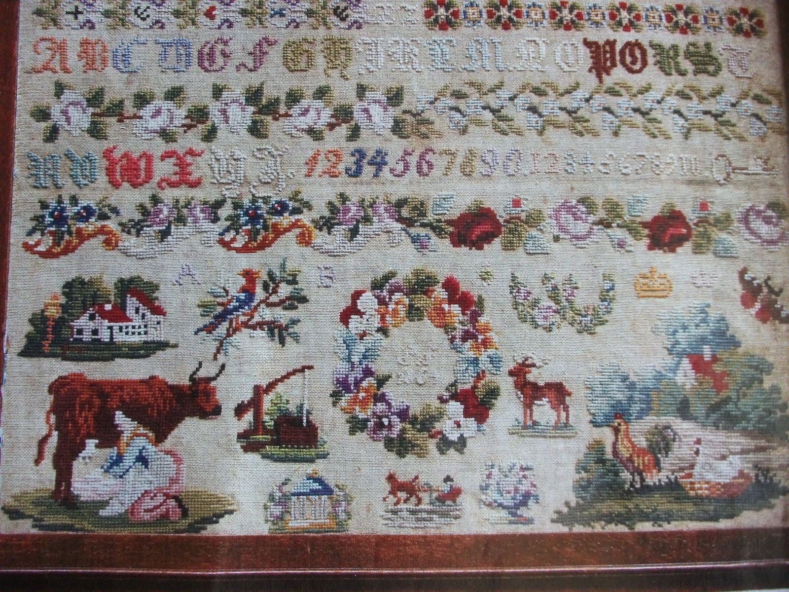 It is a re-production sampler from year 1864 with alfabets and pretty pictures .